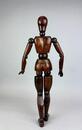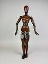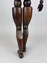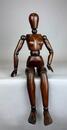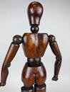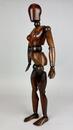 An early 20th-century articulated wooden female artist’s lay figure, finely carved and jointed throughout. The figure is constructed from richly patinated walnut with a deep, warm tone, showing signs of age and handling consistent with use. Its simplified yet anatomically proportionate form features well-defined torso curvature and articulated joints at the neck, shoulders, elbows, wrists, hips, knees, and ankles, allowing for a wide range of posing. The head and limbs are smoothly turned, with subtle hand and foot shaping.